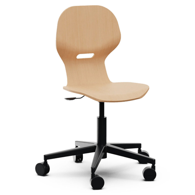 Ergonomicky tvarovaný šálový sedák z kvalitního dřeva poskytuje pevnou oporu a podporuje správné držení těla při sezení. Dřevěné provedení dodává židli nadčasový a přirozený vzhled, který se snadno začlení do různých typů školních interiérů. Pevná konstrukce zajišťuje stabilitu a dlouhou životnost i při každodenním používání. Díky kolečkům o průměru 65 mm bez brzdy je manipulace se židlí snadná a plynulá, což oceníte při flexibilním uspořádání prostoru. Součástí opěrky je praktický otvor, který usnadňuje přenášení židle a zvyšuje komfort při manipulaci.