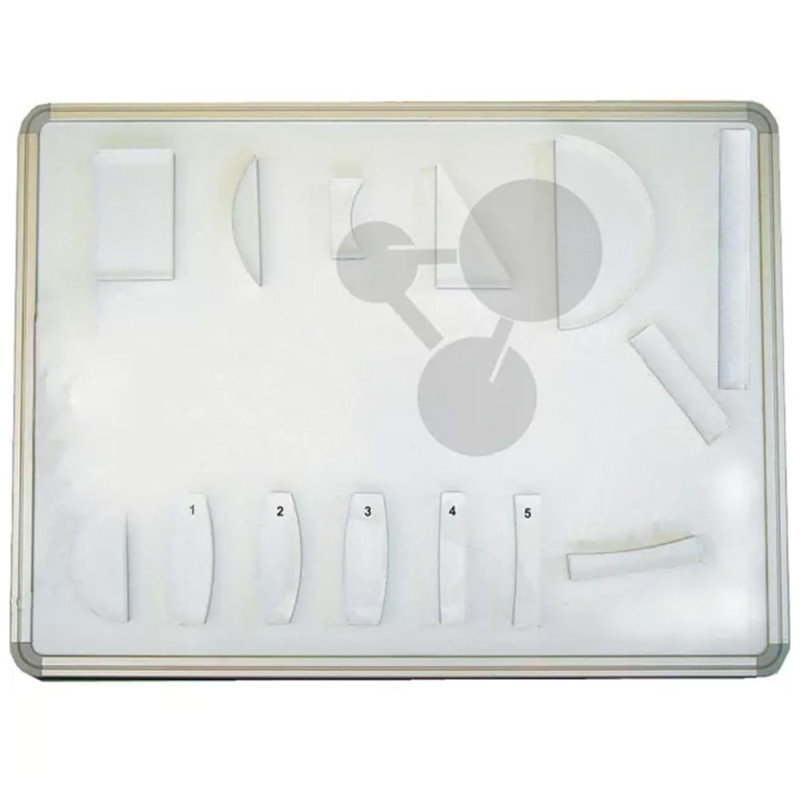 Kompletní magnetická optická sada s tabulí je určena pro názornou výuku geometrické optiky. Obsahuje magnetické optické prvky a fólie s modely, které lze snadno umístit na kovovou tabuli a sestavovat tak různé optické experimenty.