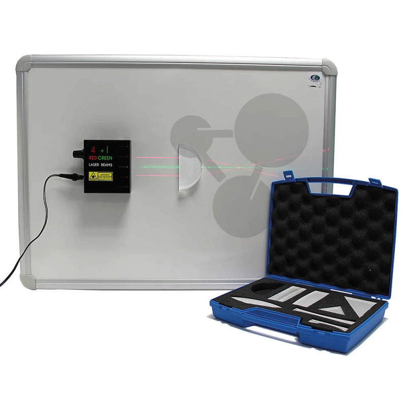 Optická sada v praktickém kufříku pro demonstraci lomu světla a práce s čočkami. Umožňuje snadné provádění experimentů s různými optickými prvky.