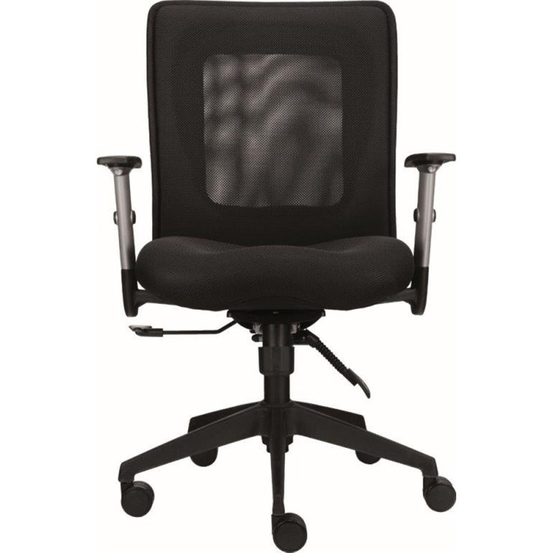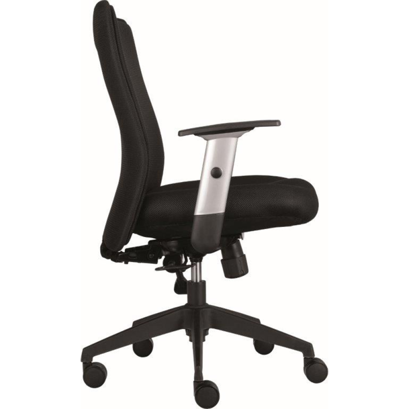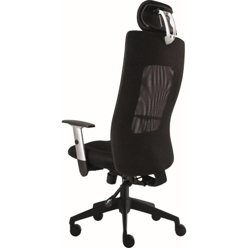 Středně vysoký síťovaný opěrák v černém provedení zajišťuje optimální cirkulaci vzduchu, zatímco čalouněný sedák z prodyšné tkaniny poskytuje vysoký komfort při dlouhém sezení. Součástí standardní výbavy jsou výškově nastavitelné područky s měkkými PU opěrkami, které podporují ergonomii a správné držení těla při práci.