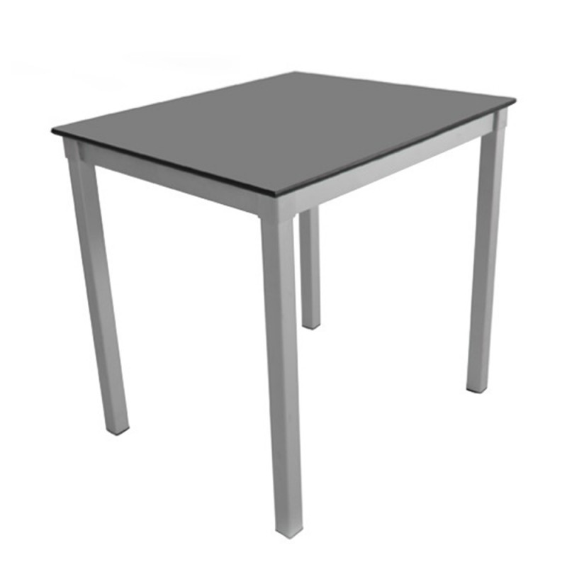 Venkovní školní stůl s laminátovou deskou odolnou vůči nejhorším povětrnostním podmínkám a konstrukcí z eloxovaného hliníku (druh chemicko-tepelné povrchové úpravy výrobků z hliníku, spočívá ve vytvoření ochranné vrstvy oxidu hliníku na upravovaném povrchu).