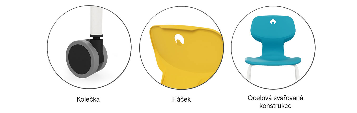 Školní židle je ideální pro vybavení kmenových tříd, jazykových učeben, technologických tříd a dalších školních prostor. Židli Soft R tvoří pevná, lakovaná kovová konstrukce, 4 kolečka a praktický, ergonomický sedák, který pomáhá udržet třídu uklizenou. Studenti si díky háčku mohou pověsit své oblečení, tašky nebo kabelky na židli.