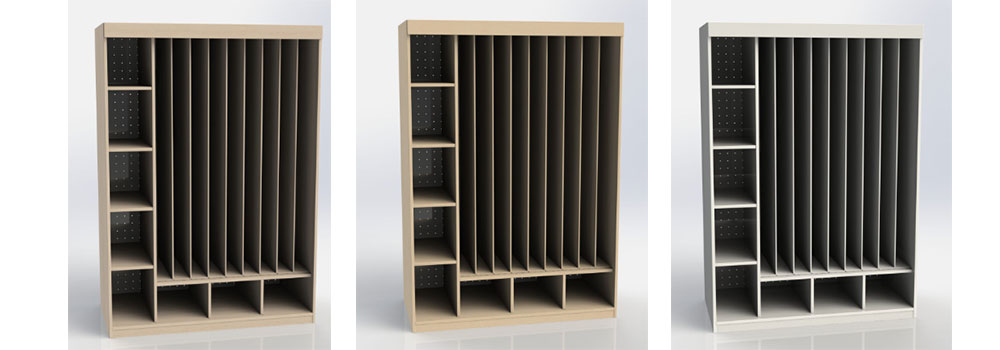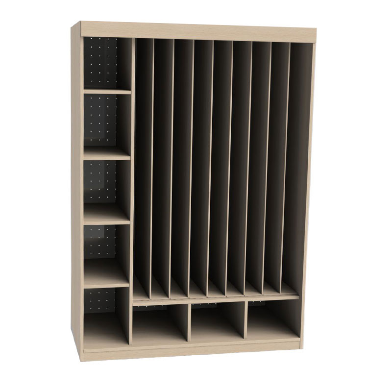 Skříň na lůžkoviny a matrace bez dveří vhodná do mateřských školek je navržena tak, aby poskytovala systematické uspořádání a snadný přístup k lůžkovinám a matracím pro až devět dětí.