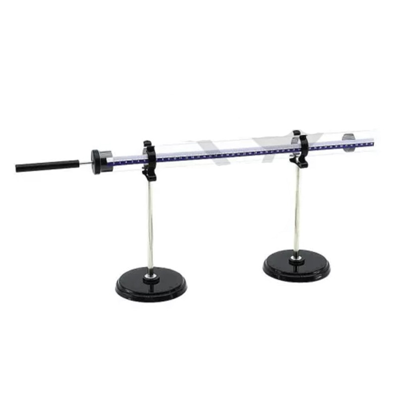 Kundtova trubice pro demonstraci stojatých zvukových vln a měření vlnové délky. Umožňuje názorné pozorování rezonance pomocí korkového prášku.
