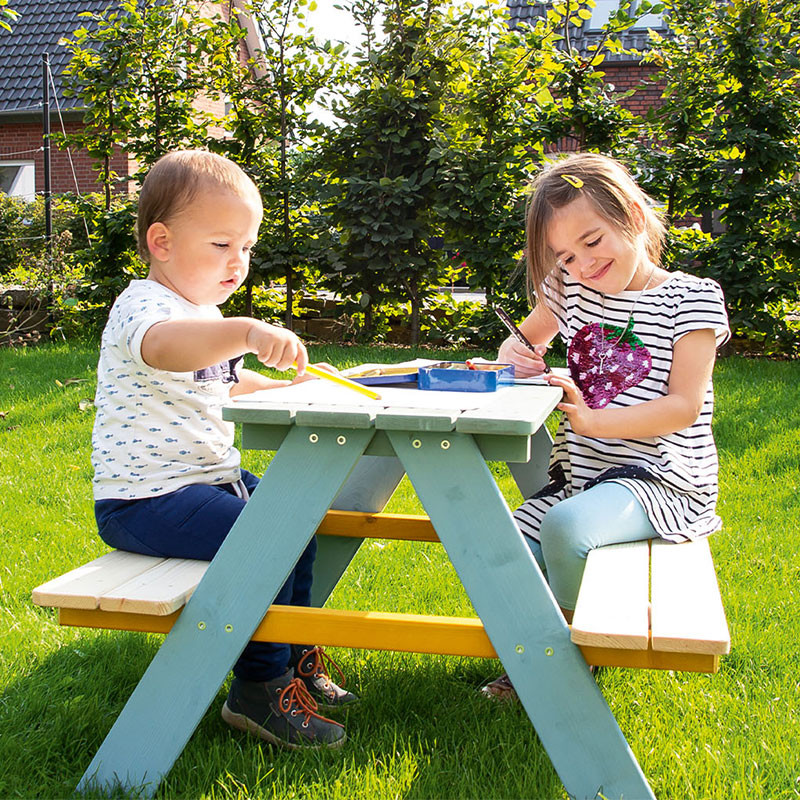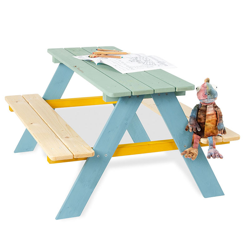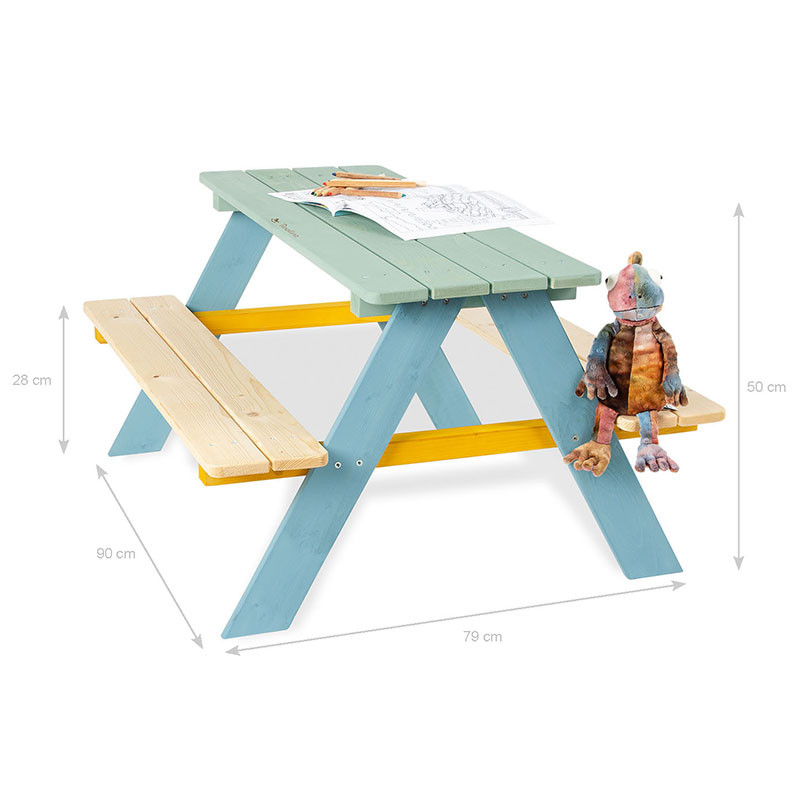 Hledáte-li stylové a praktické venkovní posezení pro děti, pak je toto tou pravou volbou. Tato souprava se skládá ze 2 lavic a 1 stolu a poskytuje dostatek místa pro celkem 4 děti. Sestava je vyrobená z kvalitního a pevného masivního dřeva. Přestože váží pouhých 7 kg, je zvláště stabilní a odolná. Díky pohodlné výšce sedu 28 cm se malí dobrodruzi a milovníci přírody mohou při pikniku odpočinout, než se zase ponoří do dalších dobrodružství. Tato souprava je ideální pro děti ve věku od 2 do 7 let.