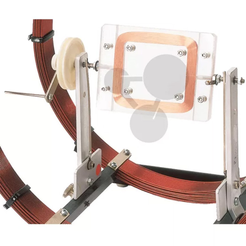 Plochá cívka v rotujícím rámu je určena pro demonstrační experimenty s elektromagnetickou indukcí. Cívka je uložena v otočném plexisklovém rámu a při použití s Helmholtzovými cívkami umožňuje názorné pozorování vzniku indukovaného napětí.