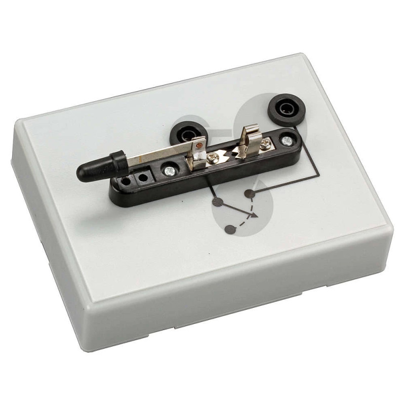 Páčkový vypínač v držáku je základní prvek pro sestavování a ovládání elektrických obvodů ve výuce fyziky. Slouží k přerušení nebo uzavření elektrického proudu.