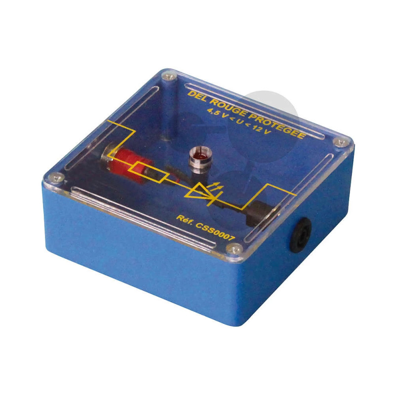 Červená LED dioda v držáku pro elektrické obvody a demonstrační pokusy. Umožňuje názorné zobrazení průchodu proudu pomocí světla.