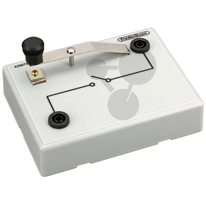 Telegrafický klíč v držáku pro spínání elektrického obvodu a demonstrační pokusy. Umožňuje vytváření krátkých a dlouhých impulsů proudu.